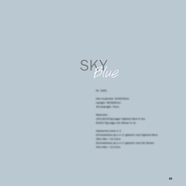 Susie viderefører sin sikre stil fra GREY DAYS – nu i blå nuancer. Opskrifterne er gennemarbejdede, designet som vi kender det fra Susie - meget enkelt og rent i udtrykket.