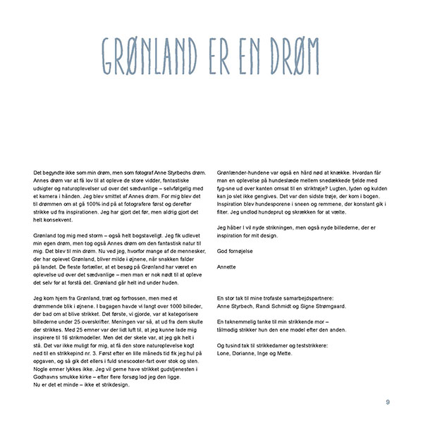 Farverne blå, hvid, grå og brun er gennemgående og tegner helheden i strikkebogen.