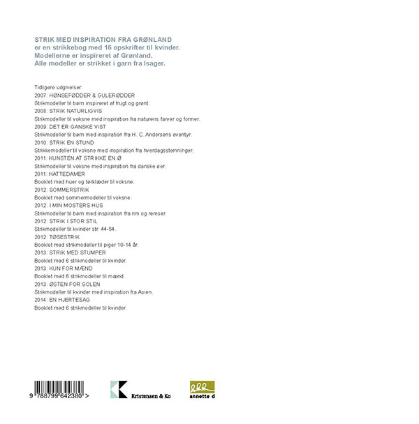 Farverne blå, hvid, grå og brun er gennemgående og tegner helheden i strikkebogen.