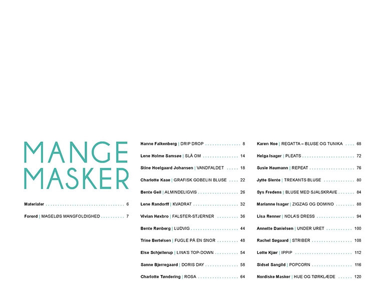 Og mange af maskerne er beskrevet af danske strikdesignere. Strikkebogen Mange Masker er et bredt udsnit af tidens strikdesign, udført af :
