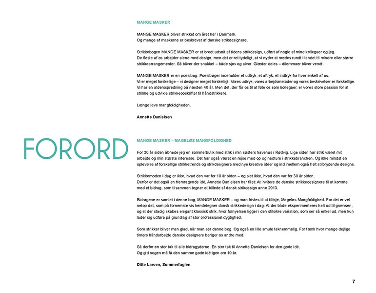 Og mange af maskerne er beskrevet af danske strikdesignere. Strikkebogen Mange Masker er et bredt udsnit af tidens strikdesign, udført af :
