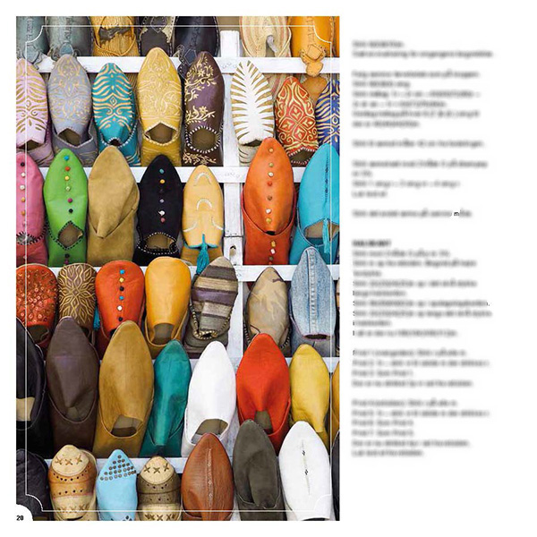 Farver, former og stemninger fra Marrakech er inspirationen bag denne strikkebog. MASKER FRA MARRAKECH indeholder 17 opskrifter til kvinder: Korte og lange cardigans, bluser og trøjer, åbne og lukkede modeller.