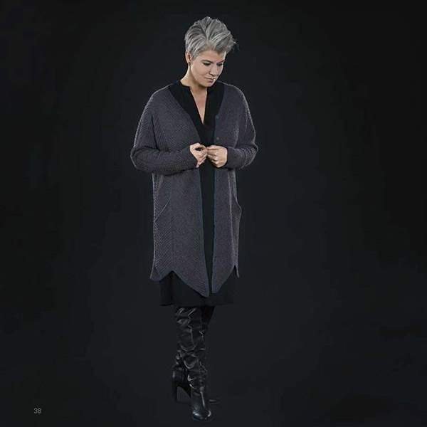 De strikketeknikker, der er anvendt, giver en overflade, hvor de mørke nuancer får lov at spille mod hinanden. Der er brugt strukturstrik, snoninger, vævestrik, men også simpel glatstrikning hvor det er ret og vrang der udgør mønsteret.