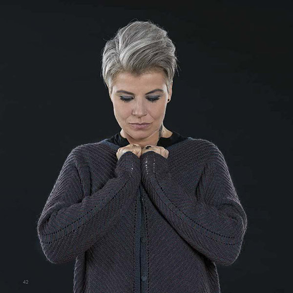 De strikketeknikker, der er anvendt, giver en overflade, hvor de mørke nuancer får lov at spille mod hinanden. Der er brugt strukturstrik, snoninger, vævestrik, men også simpel glatstrikning hvor det er ret og vrang der udgør mønsteret.