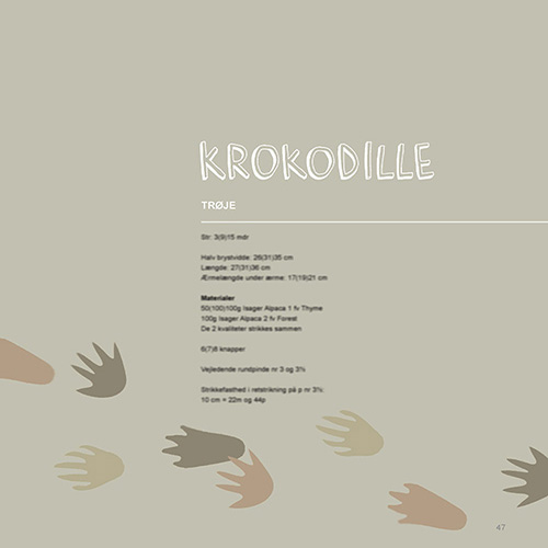 Opskrifterne er i 3 størrelser: 3(9)15 mdr Inspirationen er denne gang fra 7 vilde dyr. Til hvert dyr er der designet både en model til piger og en model til drenge.