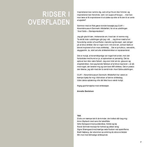 Med inspiration fra Axel Salto, Stentøjsmesteren, har Annette arbejdet videre med keramikkens udtryk og overført det til forskellige strikketeknikker, garnfarver og finurlige detaljer. Mødet mellem keramik og strik har også resulteret i sjove overflader – deraf navnet på strikkebogen. Saltos vaser og skåle er præsenteret sammen med striktrøjerne for at understrege inspirationen.