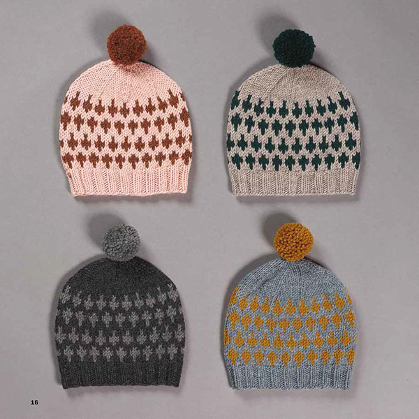 Der er skønne trøjer og sweatre, en kjole, en hue og en sej “arbejdsjakke”. Modellerne er vist i to farvekombinationer og de fleste kan strikkes til både drenge og piger.